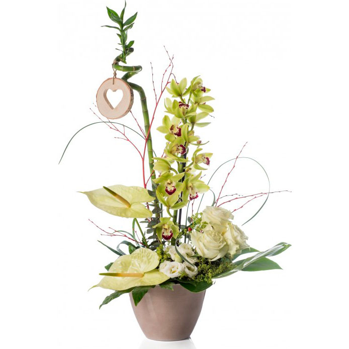 Composición floral en base de cerámica, con flores tropicales como anthurium, orquidea cymbidium, bambu, rosas….