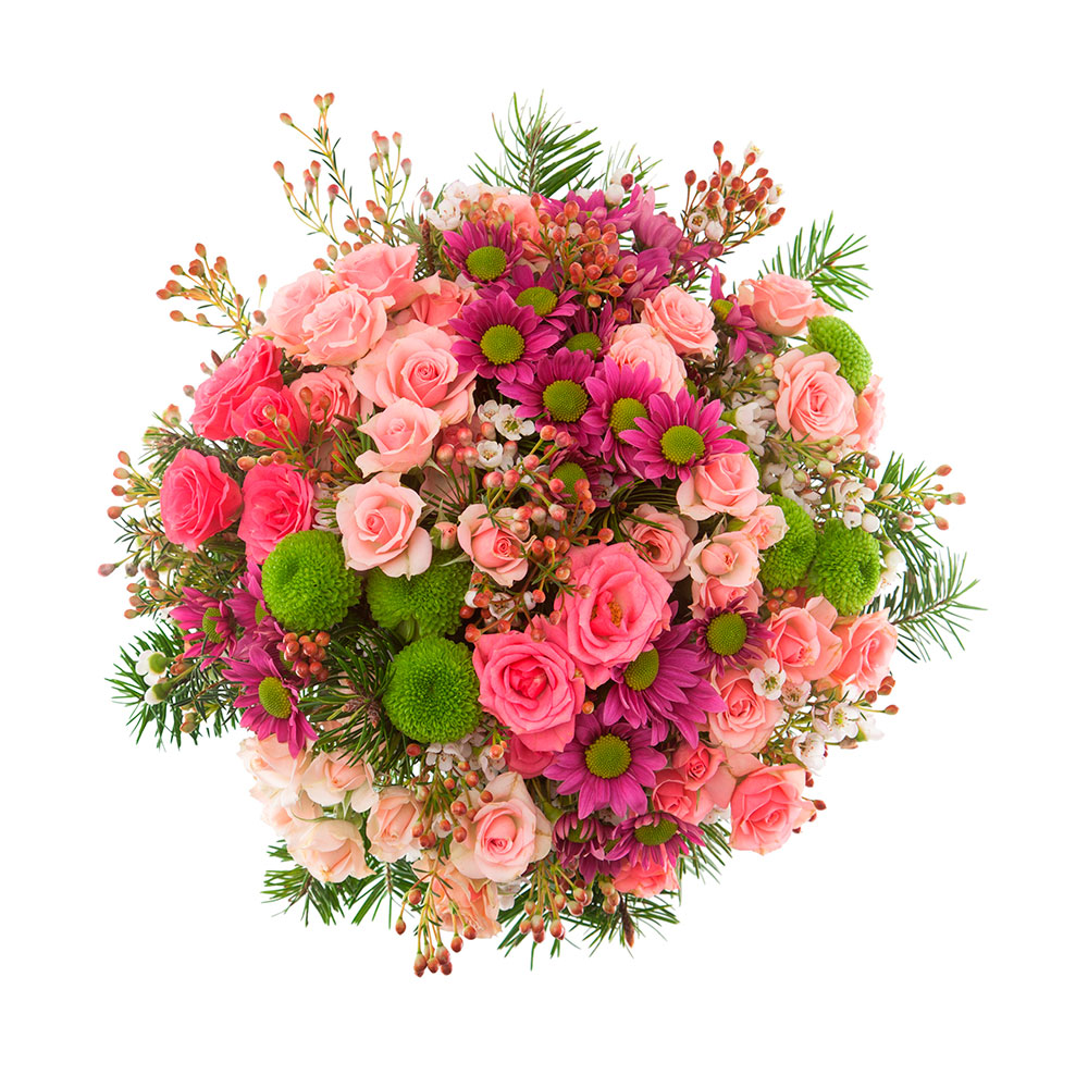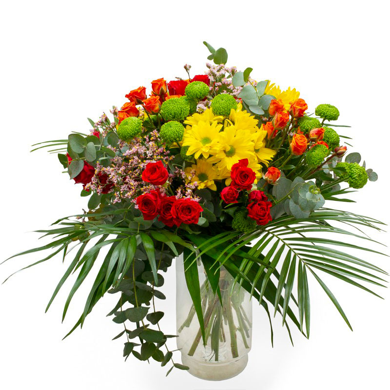 Una mezcla de crisantemos, rosas ramificadas y relleno verde para un ramo muy fresco
