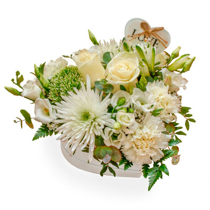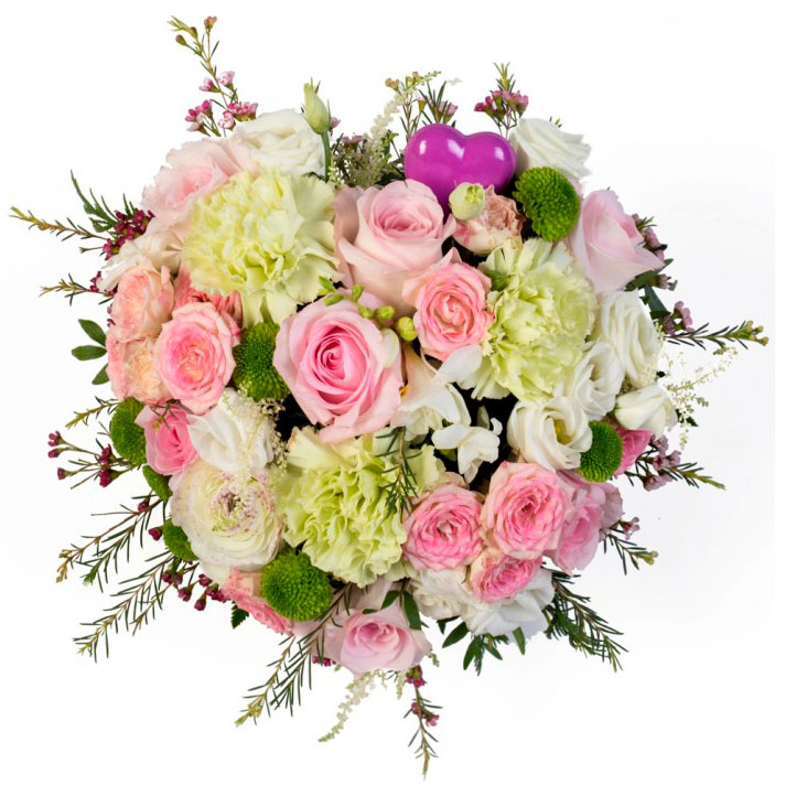 Elegante centro en forma de corazón en base en forma de corazón con flores en tonos pasteles.