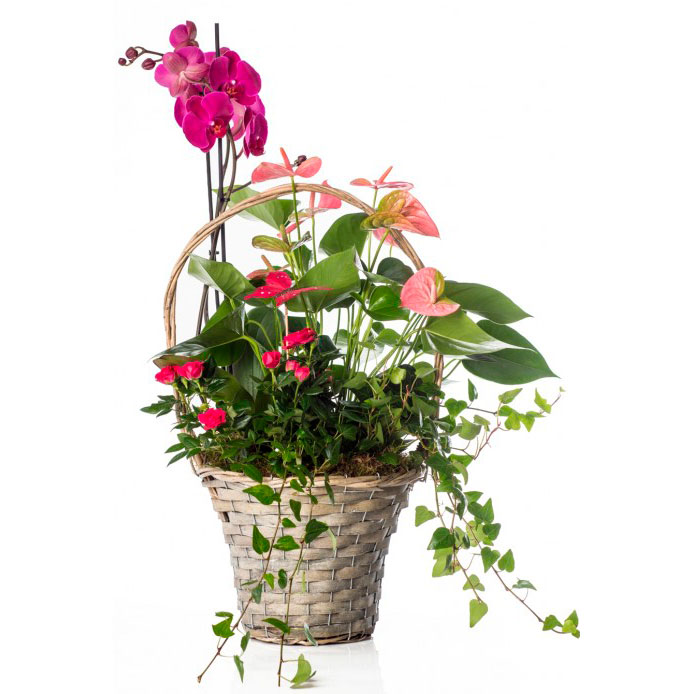 Centro de plantas de interior en tonos rosa y verde con un anthurium, una orchidea, un rosal y unas plantas verdes, en una cesta de mimbre elegante con una mariposa.
