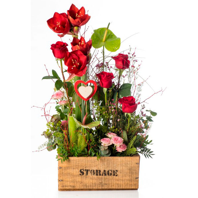 Centro de flores con base de madera en tonos rojos y verdes con amaryllis, anthurium, rosas….