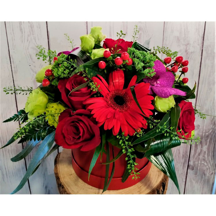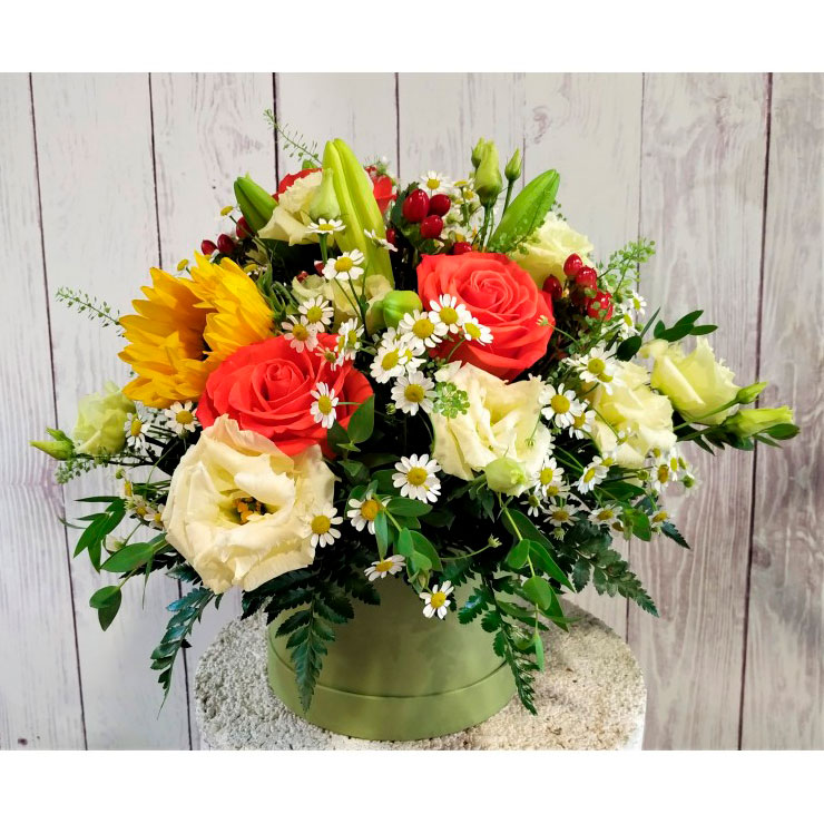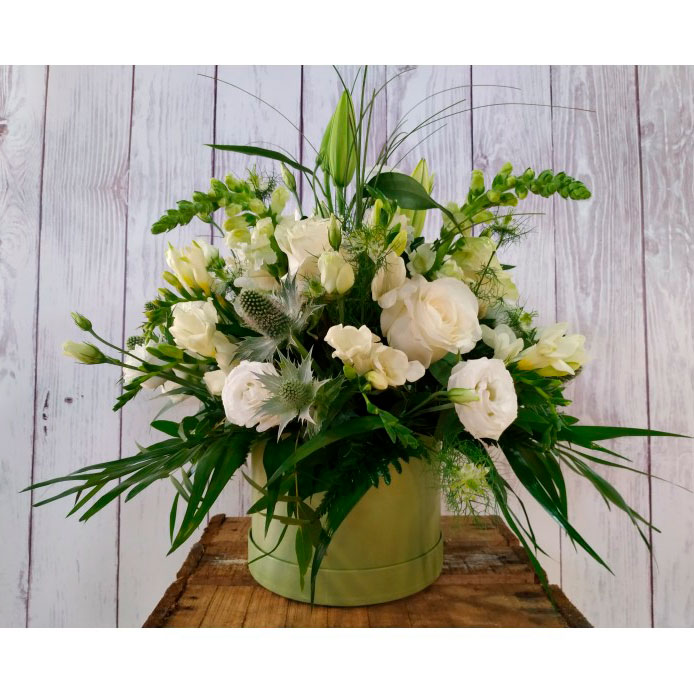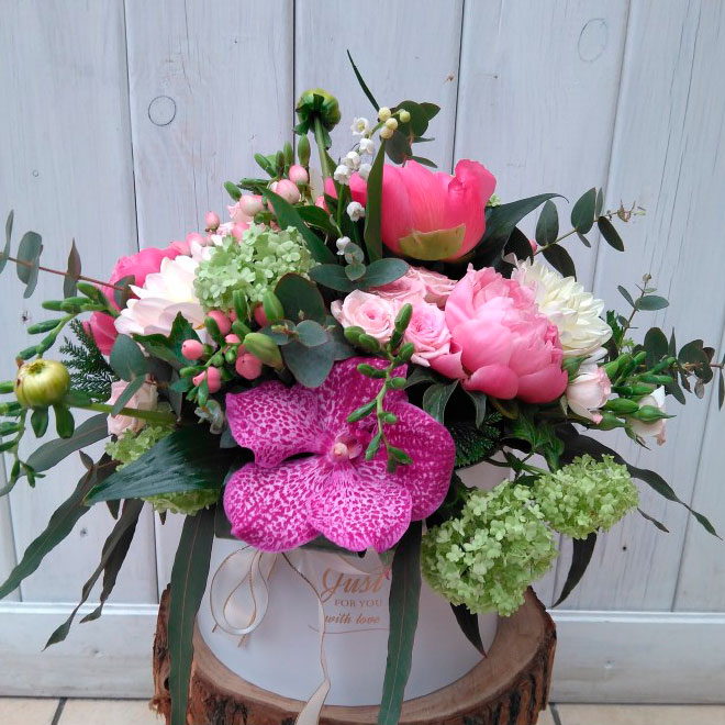 Elegante sombrerera con flores de temporada.