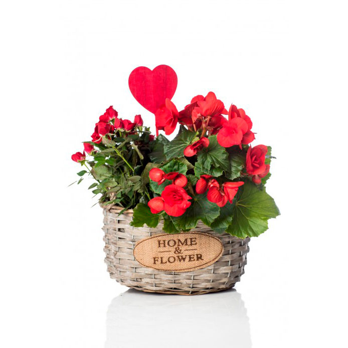 Arreglo de plantas en tonos rojos y verdes en una cesta con un corazón.