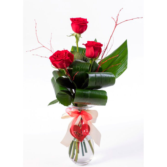 3 rosas rojas arregladas con verde y ramas rojas en un bonito jarrón de cristal